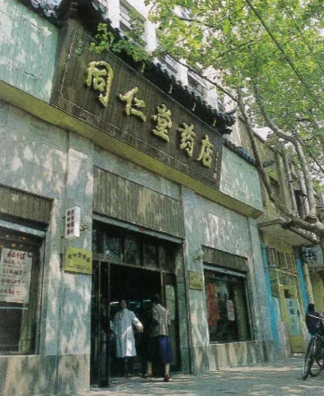 同仁堂药房,门面是一幢典型的四层民国建筑,在三山街一带最为引人注目。顶部有钟塔装饰,为三山街地标性建筑之一。这家同仁堂药房大约开业于1929年,是当时南京规模最大、最具影响力的药铺商号。该店前店后作坊,店内大厅两侧为中西药铺。中药铺迎面为高柜台,用于称药抓药;贴墙面的是一排小方格抽屉式中草药橱柜。西药铺迎面是玻璃药柜,贴墙面的是一排玻璃西药橱。厅堂中安置传统太师椅,供等候抓药的顾客歇息,厅后是中药制作坊,时有煎熬的中草药味飘溢四邻。