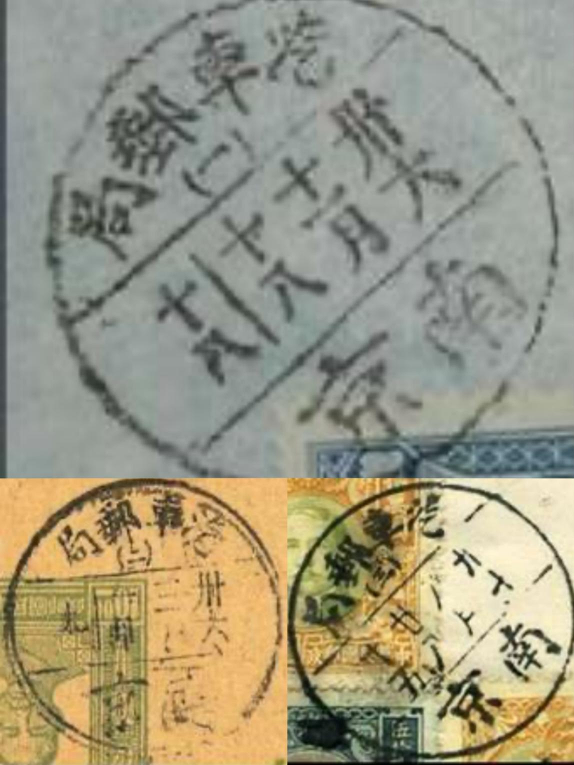 另外,每个“汽车行动邮局”还配专用邮戳一个,大小与普通邮戳相似,全戳分上中下三格,上格自右至左,横排“汽车邮局”四字,其下附(一)、(二)或(三)以区别第一、第二和第三路,中格为“年月日时”,下格为“南京”二字。