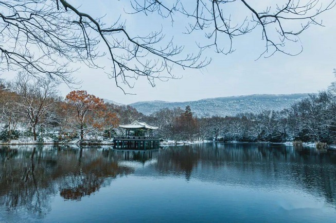 流徽榭位于南京钟山风景名胜区内,在中山陵至灵谷寺公路的南边,又名水榭亭。顶为乳白琉璃瓦,绿色立柱;三面临水,碧水如镜,倒映水榭,别有情趣。在银装素裹的冬日,它静静地伫立于苍茫的雪幕之中,仿佛一幅淡雅的水墨画卷,缓缓展开在世人面前。此时的流徽榭,似乎一直在静静等待一个愿意聆听它故事的人。
