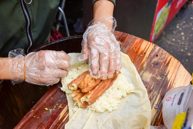 前一天傍晚,将糯米淘洗干净,“酥”一下。次日清晨,放入专用的木制蒸桶里,架在锅上蒸熟即成。蒸饭粒粒分明,白白胖胖,带着糯稻香味。计划经济时代,分二两、三两两种规格,外加一根油条对折放在铺平的蒸饭中间,再加上点绵白糖或咸菜,用干净布缠起来,最后成两头小中间大的纺锤形。有的顾客还会点上豆腐涝或豆浆,一干一稀搭着,边走边吃。