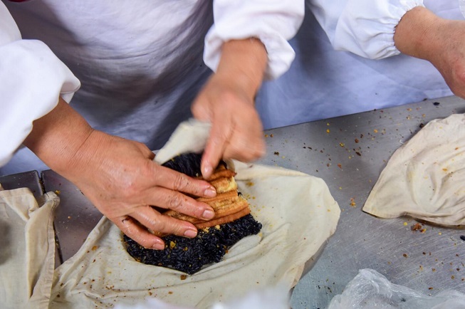 如今每年农历四月初八前后会有乌饭上市,制作工艺相较古时为易。在糯米蒸饭的过程中,加入乌饭树(学名南烛叶)嫩枝叶的汁水浸泡,再以汁水代替清水蒸制而成。成品油黑乌亮,饱满莹润,墨黑中透着青蓝的光,气味清香,香糯可口。正如浙江籍作家王寒女士在美食随笔集《江南小吃记》中写的那样:“有一年立夏,正好在南京出差”“意外地,吃到了南京的乌饭油条。蒸熟后的糯米饭乌黑发亮,放点白糖,将油条对折嵌在乌饭里,乌饭油条里有南烛叶的清香,还有油条的脆香,咬上一口,香、甜、糯、脆,让我想起夏日早晨,青草收割后倒伏在地时的气味。”