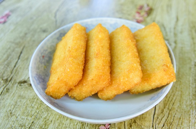 糍粑是以糯米为原料的油炸食品。糍又写作“餈”,指煮熟后捣碎,但又不是粉状。先将糯米淘洗干净,沥干水分“酥”一下,入锅加适量清水和食盐,煮成软硬适中的糯米饭。倒入一个大木框内,抹平压紧,待冷却变硬后,用刀切成长方形的胚子。胚子入油锅中炸,炸时要翻动,待金黄焦脆时出锅,沥油稍冷却即成。