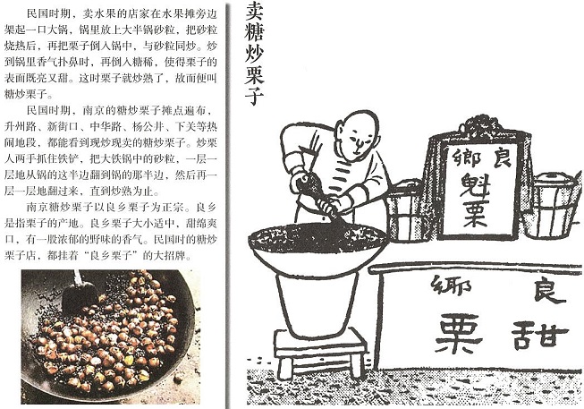 民国时期刘元漫画云:“南京的糖炒栗子摊点遍布,升州路、新街口、中华路、杨公井、下关等热闹地段,都能看到现炒现卖的糖炒栗子。”一个架起的大口锅,大半锅砂粒,再加上一个铁铲,工具基本就齐了。那时摊点全都打着“良乡栗子”的招牌。现在南京市场上的迁西栗、燕山栗就是过去的良乡栗子,其特点是:壳薄、味甜、肉粉糯。