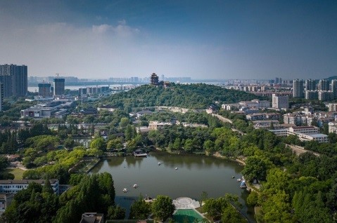 2004年建成的八字山公园,占地面积8.5公顷,共有9大景区。登临八字山四望亭,眺望阅江楼,俯瞰挹江门城楼、绣球公园和小桃园风光带,一片湖光山色,山上林木葱郁,山下鲜花遍地,真是一个城市山林的美景。