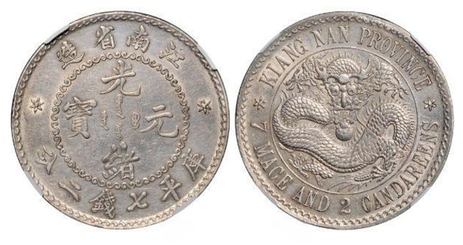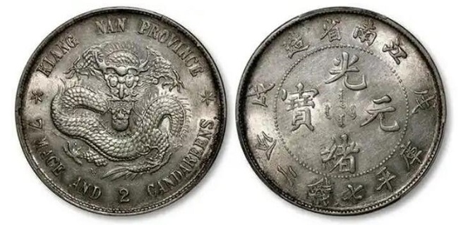 光绪十四年(1888),两广总督张之洞在广东试铸七钱三分银圆;1890年改铸七钱二分银圆。因币面有盘龙纹,故称“龙洋”。随后湖北、江苏均按此标准鼓铸。