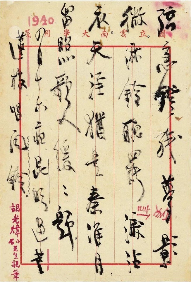 当时胡小石在国文、书法等领域名震艺坛,在金大教学期间,除授“楚辞”“杜诗”“甲骨文”外,他还开设了“书法”专业课,讲授《中国书法史》《书法要略》等。此举首开我国高校书法教育先河,培养了许多书法家和学者。著名书法家游寿女士就是他的得意弟子,其与当时久居南京的著名书法家萧娴时称“南萧北游”。