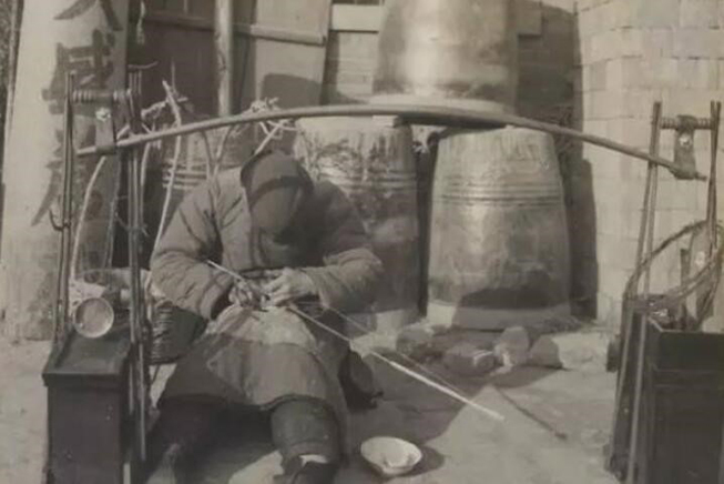 补碗和补碟子更仔细。由于碗碟是瓷的,不小心摔破了,只要碎片成形,和碗体能够弥合就可以补。工匠用装有钻石的木钻来回地转动,在破碗和碎片上钻眼,发出“丝丝丝”的声音。一旦把破碗和瓷片钻通了,露出一个小小的孔眼,工匠就用比现在订书机钉长一点、宽一点的铜巴子从破碗和瓷片的孔眼中穿过、扣上,然后轻轻地敲敲,把破碗和瓷片紧紧地咬合在一起,根据碗碟破损大小确定补上几个铜巴子,然后再抹上一点石灰泥,就不漏水了,比买个新碗便宜不少钱。