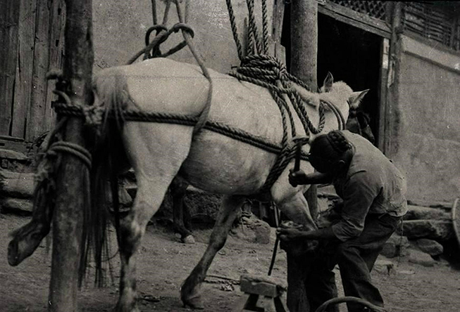 一天下午放学,我在建邺路看到师傅在钉马掌。只见一间敞开的铁匠铺,4根木柱子牢牢地扎进土里。木柱子顶端装有滑轮,粗粗的绳子穿过滑轮,连接在一块厚厚的帆布上。一人把马牵到木柱子中间,用帆布兜在马肚子下面,然后几个人合力拉起绳子让马离地悬空,一个师傅用快刀削去马蹄上的老皮。这时铁匠会将烧得红红的铁马掌放水里“呲”一下,然后迅速贴合到马蹄上,并用蹄钉敲入马蹄上厚厚的老茧里。听师傅说,钉了马掌的马走起来不伤马蹄。