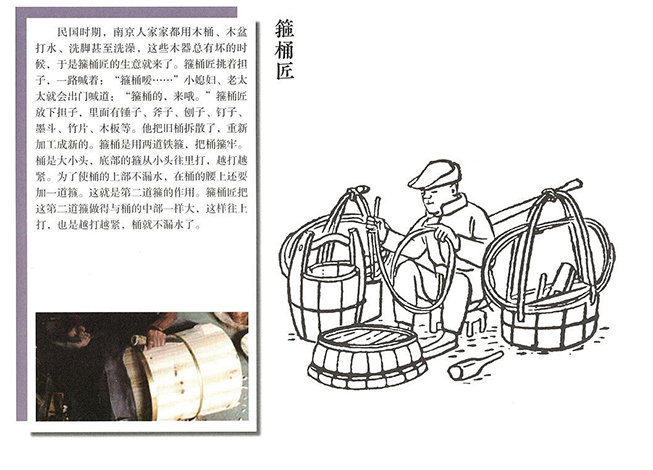 老门东有条巷子叫箍桶巷,是因为做箍桶生意而得名。有的做箍桶的工匠常常在南京大街小巷转悠,亮着嗓子吆喝“箍桶啰……”,以招揽顾客。