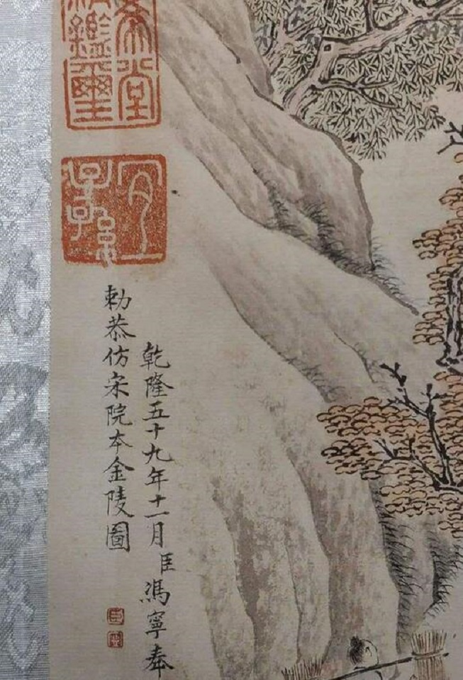 《石渠宝笈续编》载杨大章《仿宋院本金陵图》一卷:“本幅:宣纸本纵一尺一寸,横三丈一尺,设色界画。画山川、人物、城市村廛、渔舟、农具。款:乾隆五十六年五月臣杨大章恭仿宋院本《金陵图》。铃印二:大章。鉴藏宝玺:八玺全。”清廷内务府造办处的档案记载,乾隆五十七年“正月初八,太监鄂鲁里交杨大章《仿宋院本金陵图》手卷一卷,传旨交启祥宫冯宁仿画”。据嘉庆二十一年(1816)英和等人编成的《石渠宝笈三编》的《乾清宫藏十一》记载,冯宁《仿杨大章画宋院本金陵图》一卷:“本幅:宣纸本,纵一尺七分,横三丈四尺二寸五分,设色界画。画江乡城郭人物熙恬。款:乾隆五十九年十一月,臣冯宁奉敕恭仿宋院本《金陵图》。钤印二:臣宁。卷内钤高宗纯皇帝宝玺:乾隆御览之宝。鉴藏宝玺:五玺全。”冯宁从“乾隆五十七年正月初八”接到临摹任务,到画面上落款的“乾隆五十九年十一月”,一共费时两年多才画出第三幅摹本。或许因冯宁的摹本晚出,所以比杨大章的摹本更长。