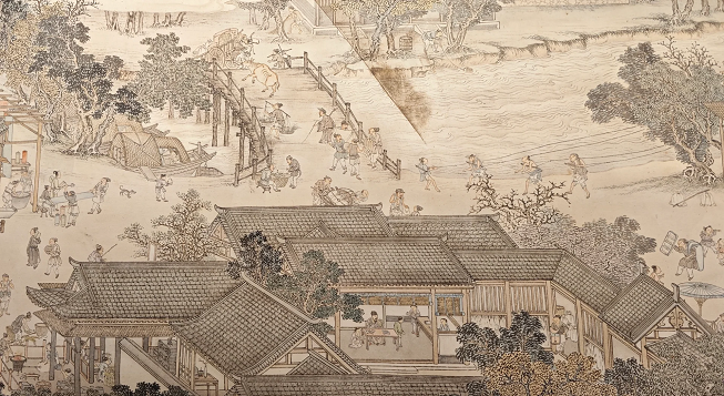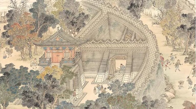 期间,乾隆皇帝下令谢遂、杨大章、冯宁等人临摹,其中谢遂、杨大章的摹本现在“台北故宫博物院”。据《石渠宝笈续编》第三十五《重华宫藏十二》记载,谢遂《仿宋院本金陵图》一卷:“本幅:宣纸本,纵一尺一寸,横二丈九尺三寸五分,设色界画。画山川、人物、城市、村廛、渔舟、农具。款:乾隆五十二年二月臣谢遂恭仿宋院本《金陵图》。铃印二:臣遂。鉴藏宝玺:八玺全。”谢遂《仿宋院本金陵图》完成于“乾隆五十二年”,虽然时间最早,但漏画了很多内容。或许当年正因谢遂省略太多,后才有杨大章、冯宁续摹本。