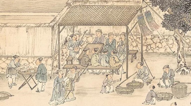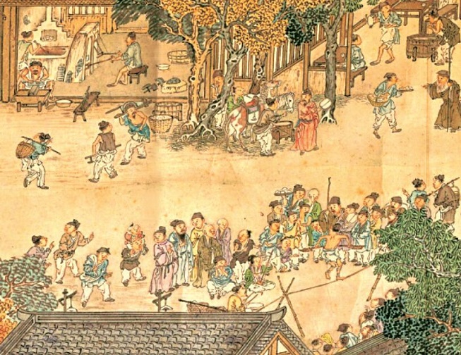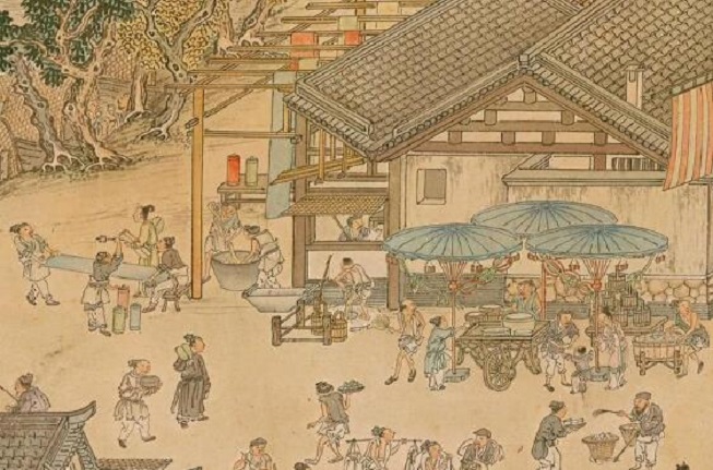 清化桥的东南,正是纺织业作坊集中的锦绣坊,《景定建康志》卷十六记载东锦绣坊在御街左,西锦绣坊在御街右。今天鸽子桥(清化桥)的东南部,还有绒庄街、绫庄巷等地名。今天鸽子桥的西南是打钉巷,原来是铁匠作坊,而《金陵图》清化桥西南第一个作坊正是打铁的铺子,有人在推动风箱给高炉加温。门口的台子上有梯形的打铁基座,下面还有一些铁制品。门前西侧有人在磨刀,东侧树下有两匹马,有人来钉马掌或买马镫。大门正前方有两个人,一个人手持铁锯,一个人肩扛工具。