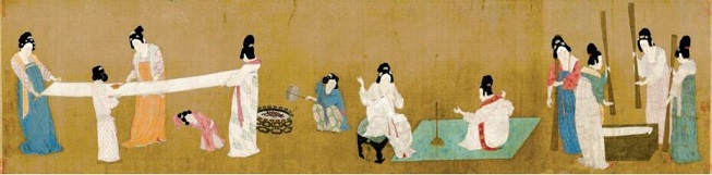 清化桥(景定桥、鸽子桥)的东南方,画有一座纺织作坊。有两个人手拉很长的布匹,另外有两个人在旁边协助加工。作坊外的木架挂有多种颜色的布匹,有红色、蓝色、黄色。有两个人手持木杵,在缸中捣练,练布织出来时比较坚硬,需要煮沸、漂白,再用木头捶捣才变得柔软。现存美国波士顿博物馆的唐代张萱《捣练图》,所绘画面与《金陵图》非常类似。