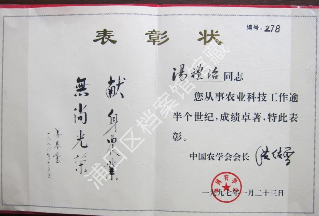 1997年,因长期从事农业科技工作,汤礼治获中国农学会的表彰。