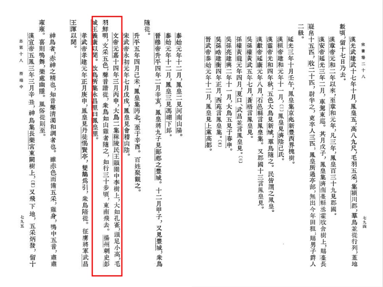 文帝元嘉十四年三月丙申,大鸟二集秣陵民王顗园中李树上,大如孔雀,头足小高,毛羽鲜明,文采五色,声音谐从,众鸟如山鸡者随之,如行三十步顷,东南飞去。扬州刺史彭城王义康以闻。改鸟所集永昌里曰凤皇(凰)里。