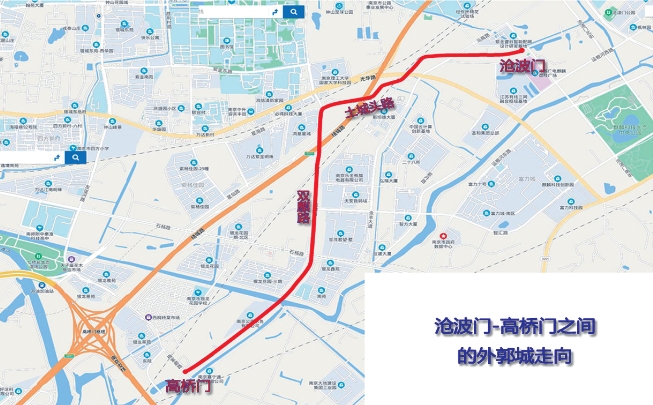 从沧波门出发到高桥门一带,大约需要沿明外郭城垣遗迹西南方向行约5公里。在历史上,高桥门是通往南京城的重要城门之一。进入高桥门,西北行数里即到达七桥瓮,再前行经过秦淮河上的中和桥,便可以直入明代皇宫御道尽头的正阳门(今光华门)。