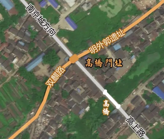 在到达高桥门之前,自东而来流经沧波门的运粮河穿过外郭城墙,流至七桥瓮与秦淮河交汇。明代在其穿过外郭城墙处设有小水关。过了小水关,往西再行约一公里即可来到高桥门门址处。高桥门之名源自门前有高桥一座,位置不难确定,因为如今高桥尚在。这座经过多次改建的高桥位于上高路(上坊镇至高桥门,亦称高上路)上,所以,上高路和双麒路的交叉口(北侧称为梅家廊路)理应就是高桥门门址。