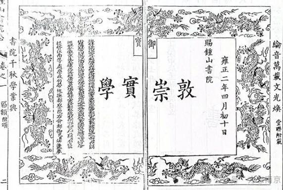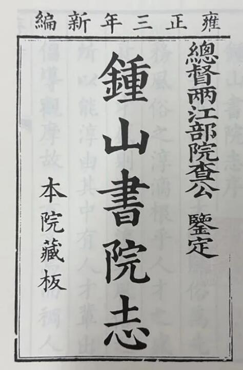 《钟山书院志》,于雍正三年(1725)在两江总督查弼纳的授意和允准下,由时于书院肄业的江西建昌府学廪生汤椿年纂辑、江南苏州府长洲县学附生金增编校,当年告成,付梓刊行。