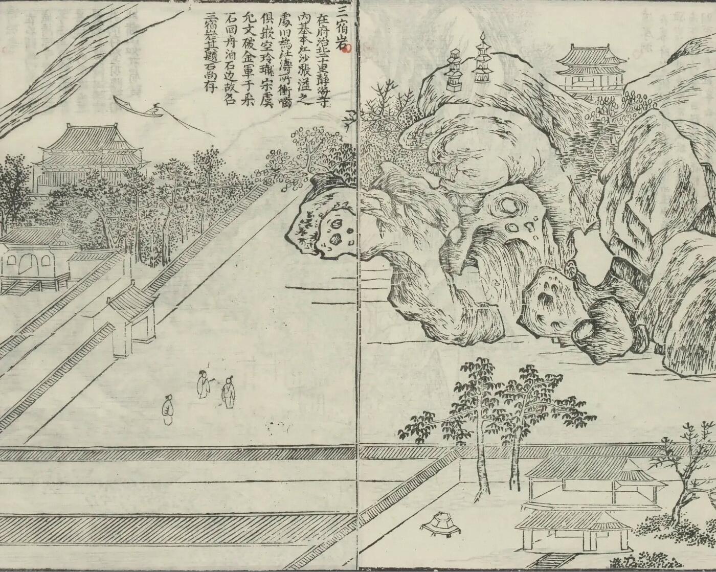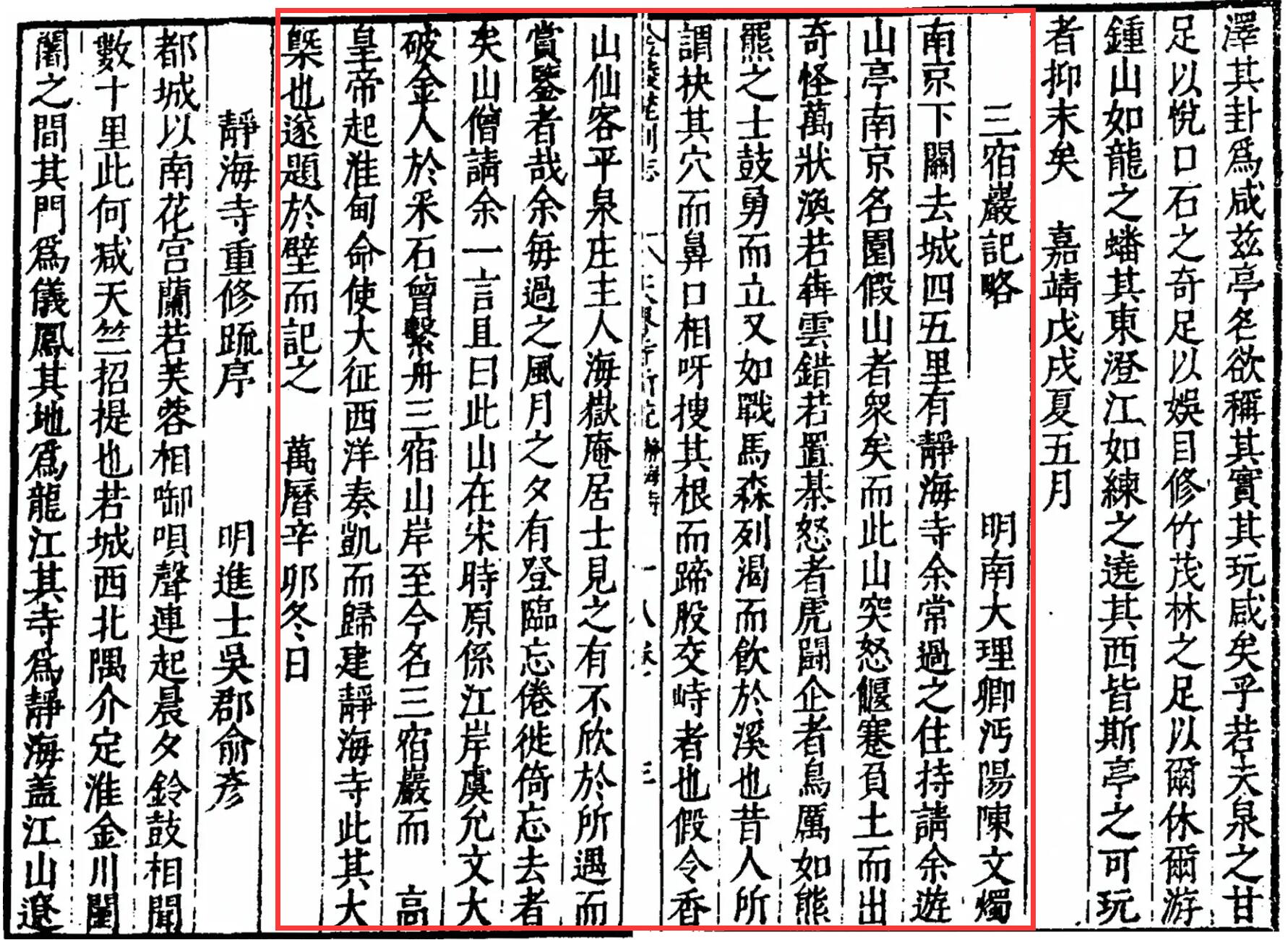 刊刻于清康熙七年(1668)的《江宁府志》,卷二图纪有金陵四十景图,其中对“三宿岩”图题字:“三宿岩在府治北二十里静海寺内。基本江沙涨溢之处,旧为江涛所冲啮,俱嵌空玲珑。宋虞允文破金军于采石,回舟泊石边,故名三宿岩。其题石尚存。”