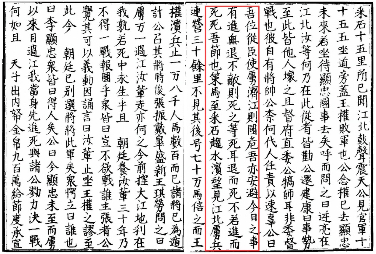 绍兴三十一年(1161)秋,金帝完颜亮统率数十万军队越过淮河,进逼长江。两淮前线宋军溃败,金军如入无人之境。危急关头,虞允文挺身而出。十一月初六,虞允文以中书舍人参谋军事的身份,协助出督江、淮军事,并慰劳驻军。此时的采石矶到处都是南渡的散兵游勇,士气低落,人心惶惶。这时有人劝他不必替人承担责任,对此虞允文慨然道:“吾位从臣,使虏济江则国危,吾亦安避?今日之事,有进无退,不敌则死之,等死耳,退而死,不若进而死,死,吾节也。”