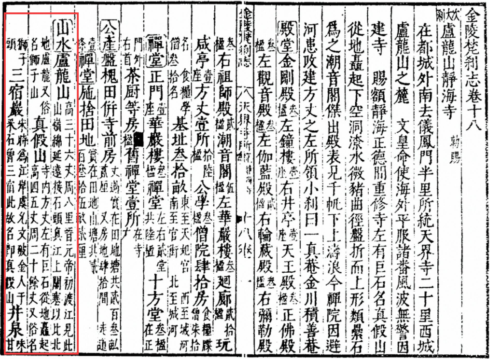 成书于同一时期的《金陵梵刹志》卷十八“卢龙山静海寺”篇有这样一段文字:“卢龙山,高三十六丈,周八里。晋元帝初渡江,见此山岭绵延,远接石头,真江上开塞,以比北地卢龙,又俗名狮子山。真假山,寺内方丈左有巨石,从地矗起,高四五丈,周二十余丈,又俗名狮子头。”三宿岩之所以叫“真假山”,“真”应当是指它天然生成,“假”或许是指其岩体瘦、皱、漏、透,犹如假山石。