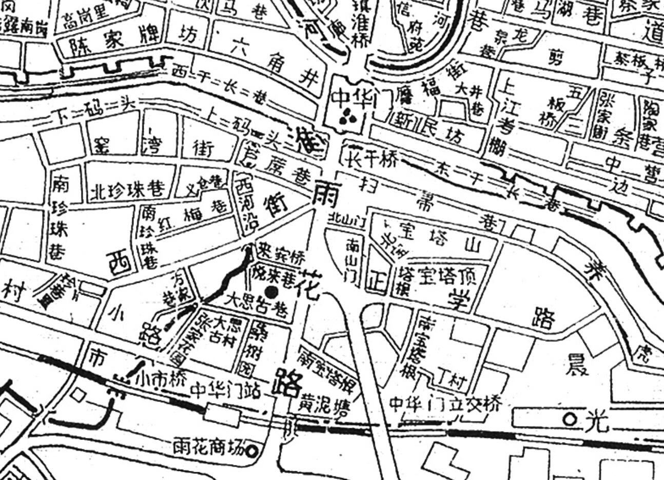 从长干桥向南,一条笔直的大马路直通雨花台,此为雨花路。未改造前,它是南门外最繁华的一条街。从长干桥下来,雨花路东有燕翅口、扫帚巷、北山门、正学路、南山门;西有上码头、芦席营、西街、悦来里、悦来巷、小思古巷、大思古巷等。雨花路上,两边店铺林立,商贾云集,百年老店随处可见。锅碗瓢盆、南北干货、油盐酱醋、量体裁衣、特色餐馆、风味小吃、瓮堂浴室,甚至酒肆茶坊、评话说书、扬州戏曲、生旦净丑,应有尽有。