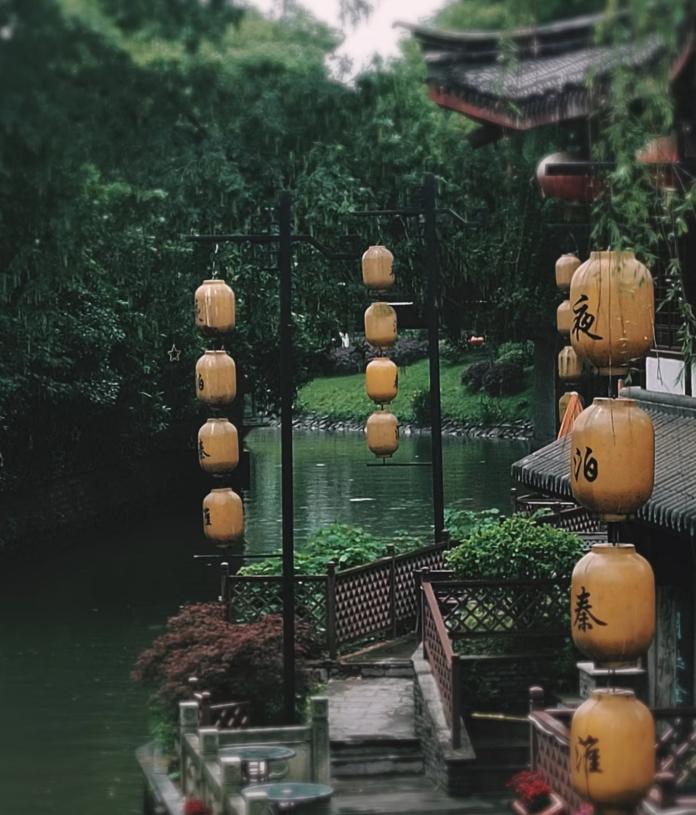 岸上的桃花正绽开春红,细柳依依,将新生的叶子垂向水中。渡口东南向连片的旧院河房雕梁画栋,临水露台檐上悬着的角灯此刻早已熄了烛火,不见夜里的通明。