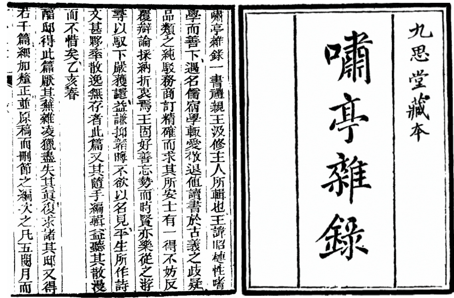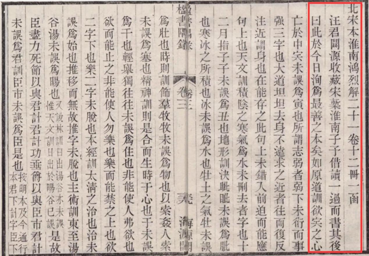 楝亭珍藏的孤本秘籍有《毛诗要义》20卷、《毛诗谱序要义》1卷,宋魏了翁撰,宋精刻本,海内孤本,为文渊阁著录所未及,阮文达采进四库遗书时也未得见。《淮南鸿烈解》21卷,汉许慎注,北宋刻本,顾广圻借汪阆源(士锺)藏北宋刻本以校《道藏》本,列举误字、脱字、衍文等五十余条,称“以上诸条,实远出《道藏》本之上,而他本无论矣。至于注文,足正各本之误者,尤不胜枚举。”而感叹:“此于今日,洵为最善之本矣。”