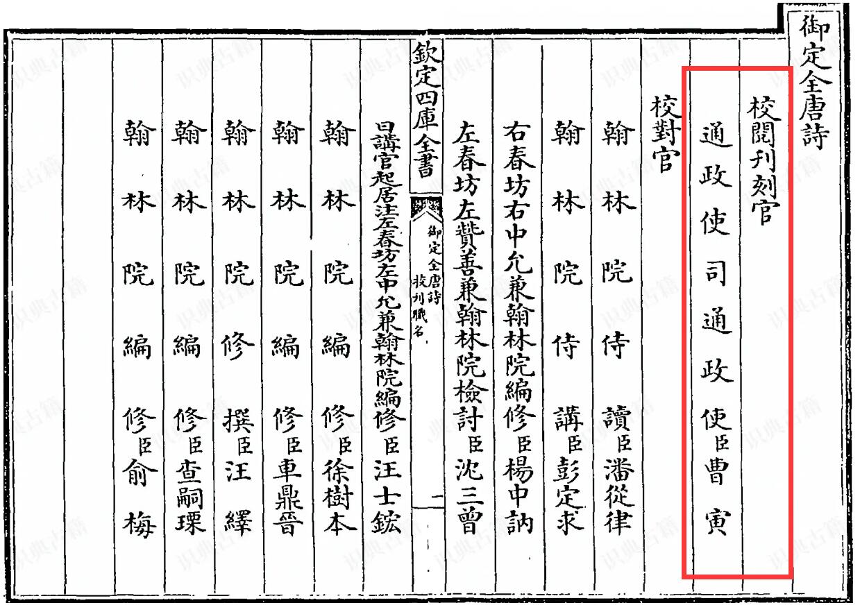 内廷御籍的刊刻,多命曹寅董理。所刻书籍,雕刻之精美胜过宋版,海内所称“康版书”自曹子清始。《全唐诗》900卷《目录》12卷,子清主持刊刻,自康熙四十四年(1705)五月初一开诗局于扬州天宁寺,至翌年十月初一竣工,历时一年零五月。参与校订者有闲居江浙的在籍翰林彭定求、沈三曾、杨中讷、潘从律、汪士鋐、徐树本、车鼎晋、汪绎、查嗣瑮、俞梅等人。《全唐诗》收诗48900余首,作者2200余人。以清内府所藏明胡震亨《唐音统签》、清初季振宜《唐诗》为底本,旁采其他唐人诗集编辑而成,其中不少为子清楝亭藏书。清人马玉堂诗云:“子清诗局本书巢”。整套书的字体参取欧阳询体与赵孟頫体精写上版,镌刻娟秀,一笔不苟,成为中国雕版史上别具一格的艺术精品。书版庋藏金陵汉府街江宁织造局,但不幸毁于洪杨之役。
