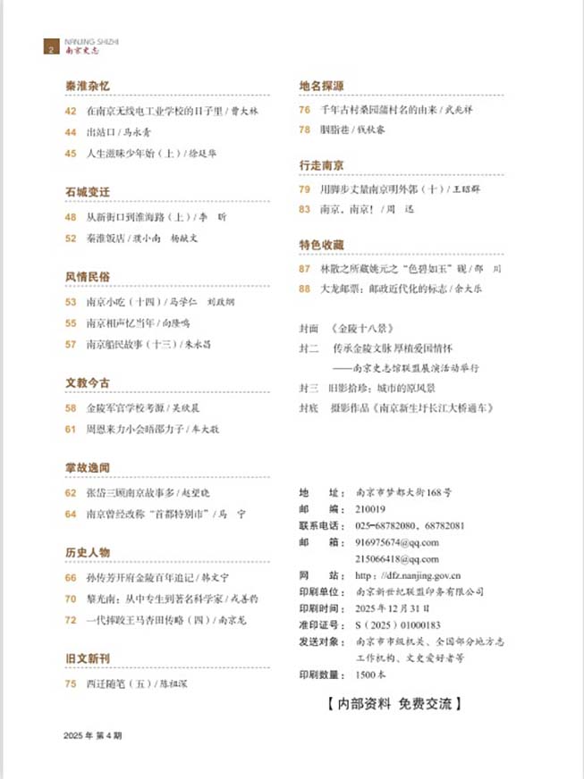 近日,《南京史志》第四期编印完成。全刊88个页码,约15万字(包含80余张图片),设有文化名城、金陵文脉、探索发现、史海钩沉、修志园地等栏目。