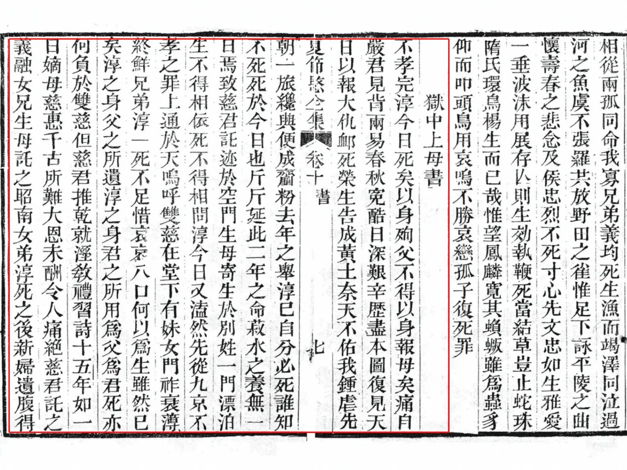 陈子龙的爱徒、神童诗人夏完淳(1631~1647),更是一名杰出的少年爱国英雄。他14岁就参加抗清活动,写了大量的爱国诗文。《即事》《送客金陵》《柬半村先生》《狱中上母书》《采桑子》等诗文,表现了作者不屈不挠的民族气节、视死如归的斗争精神和才华横溢的形象。《狱中上母书》近700字,是夏完淳在狱中用辞赋语言写给他母亲的一封家书。综观全篇文字,悲壮凄婉、血泪交融,从亲属之情到民族之恨,从杀父之仇到亡国之痛,既有绵绵无尽之恨意,又有男儿凌云之壮志。