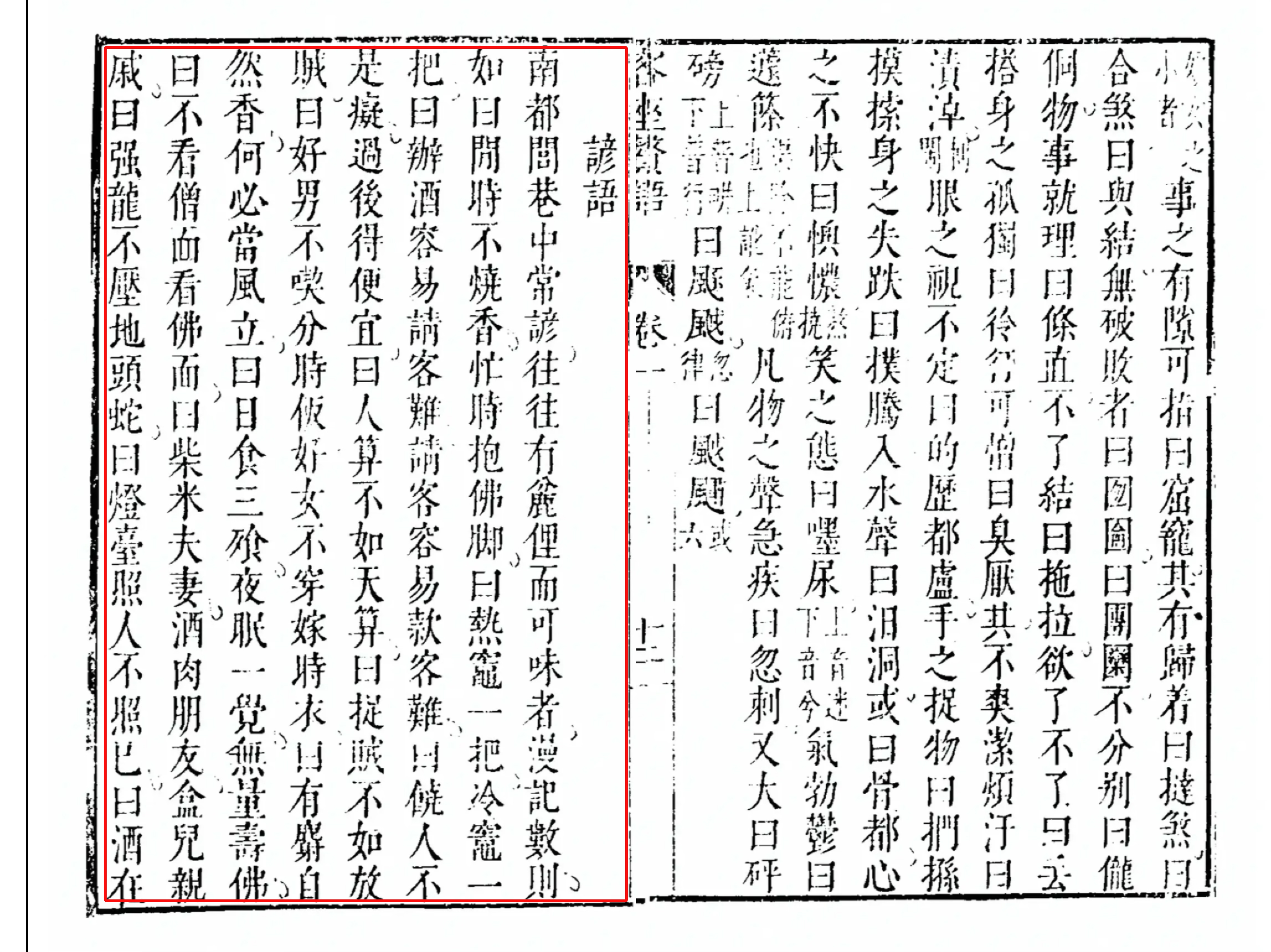 汉语中的谚语、惯用语、歇后语等统称为语汇,比如我们所熟知的“大家马大家骑”“三天不吃青,肚里冒火星”“出了南门——尽是寺(事)”“文德桥的栏杆——靠不住”等。我们从古代文献中可以找到不少这样的语汇。明代南京有个叫金銮的散曲家,用金陵谚语创作了二十几首散曲。顾起元的《客座赘语》收录“南都闾巷中常谚”二十余条。