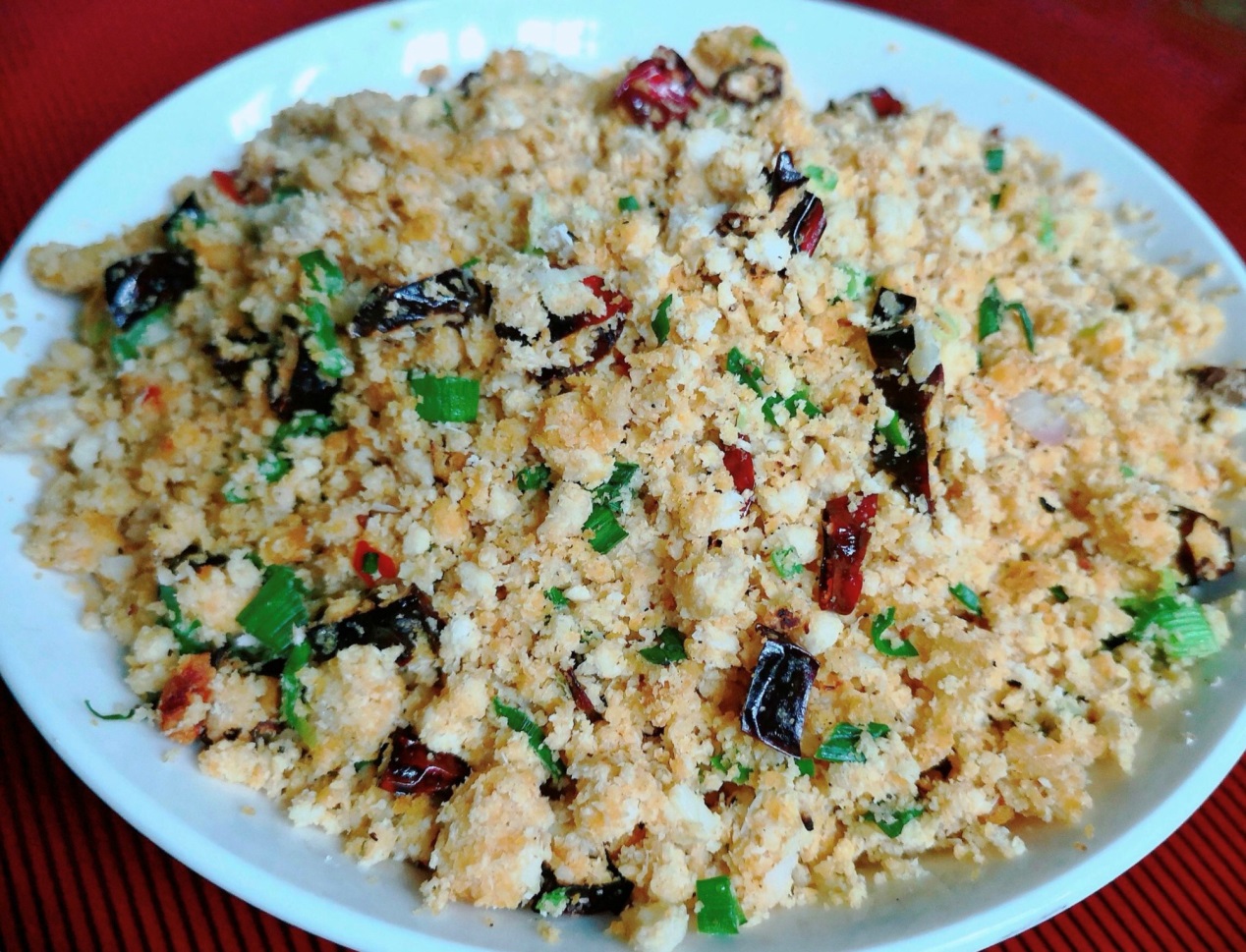 我小时候,一分钱就能到附近鸡鹅巷的一家豆腐店买一大碗豆腐渣。把豆腐渣买回家,配上一碟蒜叶或葱叶末,加油、盐炒制,如果火大,翻炒十来下即可装入菜碗。它好似雪花中飘落着片片绿叶,色香味俱全,香喷喷、咸滋滋的。母亲总会在雪花菜快起锅时,挑一筷猪油进去,让雪花菜看起来油亮亮的,十分诱人。雪花菜冷却后,卤汁也会凝固,就成了雪花菜冻。把雪花菜冻堆在白米饭上,更衬托出雪花菜色浓香醇味美。