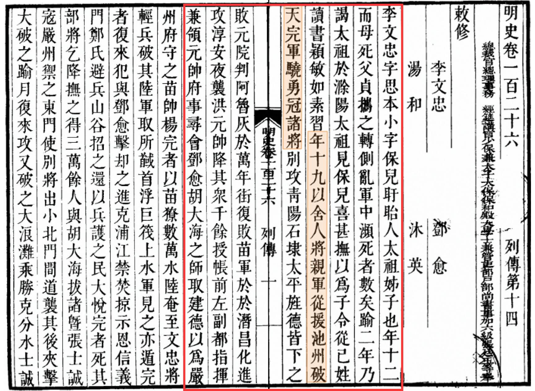 至正十七年(1357),19岁的朱文忠首次随军出征,便展现出超凡的军事天赋。初生牛犊不怕虎的他,以舍人(后备军官)身份率领亲军支援池州,初战便击败天完军名将赵普胜,“骁勇冠诸将”。随后又接连攻克青阳、石埭、太平、旌德四个县。进攻淳安时,他采用夜袭战术,“破伪洪元帅营,降其众千余”。战后,朱文忠被授予帐前左副都指挥的官职,并兼管元帅府事务。