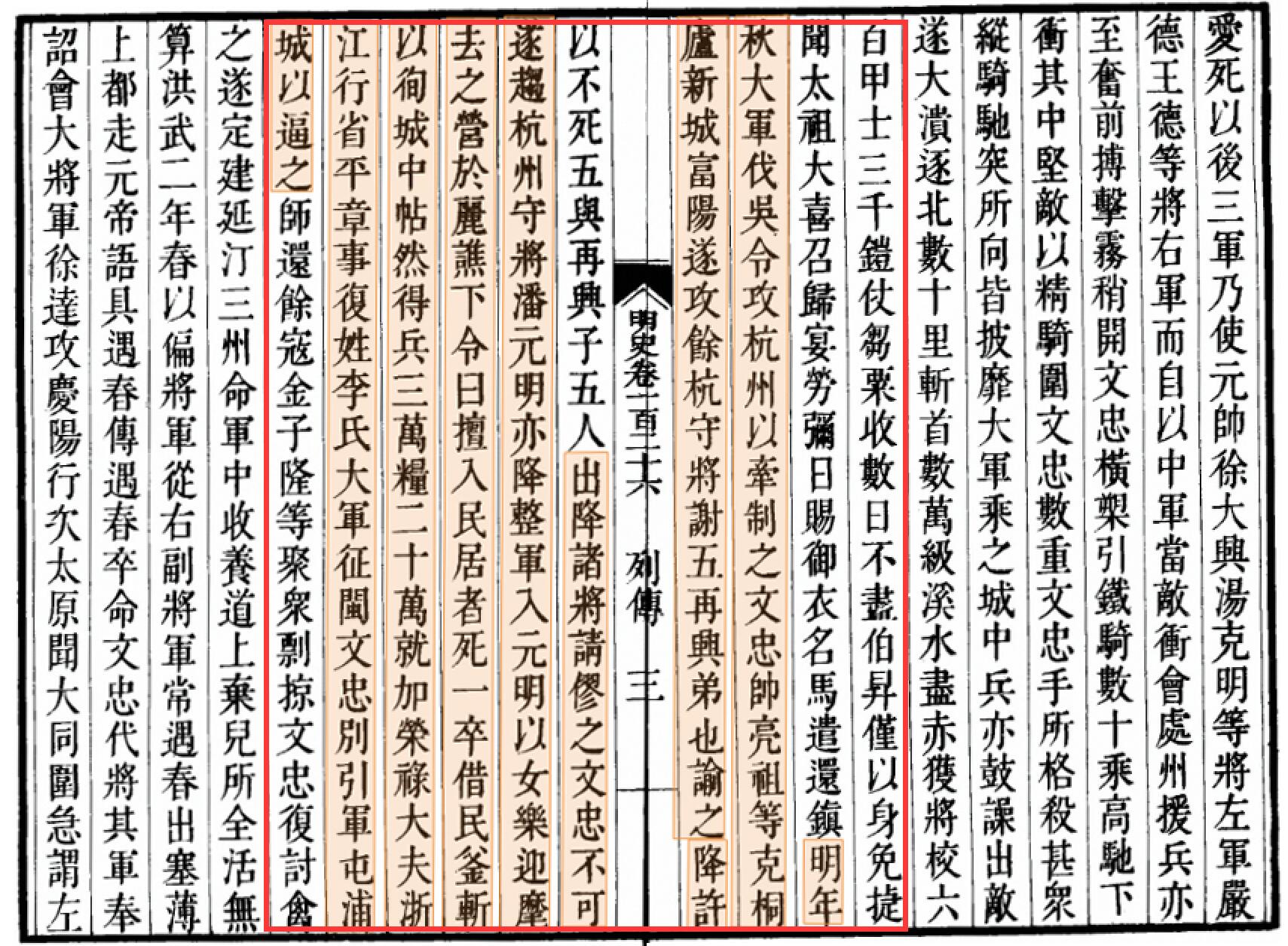 至正二十六年(1366)秋,朱元璋的大军讨伐张士诚,朱文忠受命进攻杭州以牵制敌军。朱文忠率部将连续攻克桐庐、新城、富阳,进攻余杭时,守将出城投降,诸将请求将其处死,朱文忠知道人心向背的重要性,坚决不同意。随后进攻杭州,杭州守将听闻献城不杀,于是开城门投降。或许是因幼年跟着父亲四处躲避战乱的经历,让朱文忠懂得普通百姓最大的期盼,因此在进入杭州前,他下令:“擅入民居者死。”据说一名士兵仅因借用百姓炊锅,便被斩首示众,杭州城中因而秩序井然,军队也因此获军三万,粮食二十万石。因卓越战功,朱文忠被朱元璋加封为荣禄大夫、浙江行省平章事,并恢复李氏之姓。