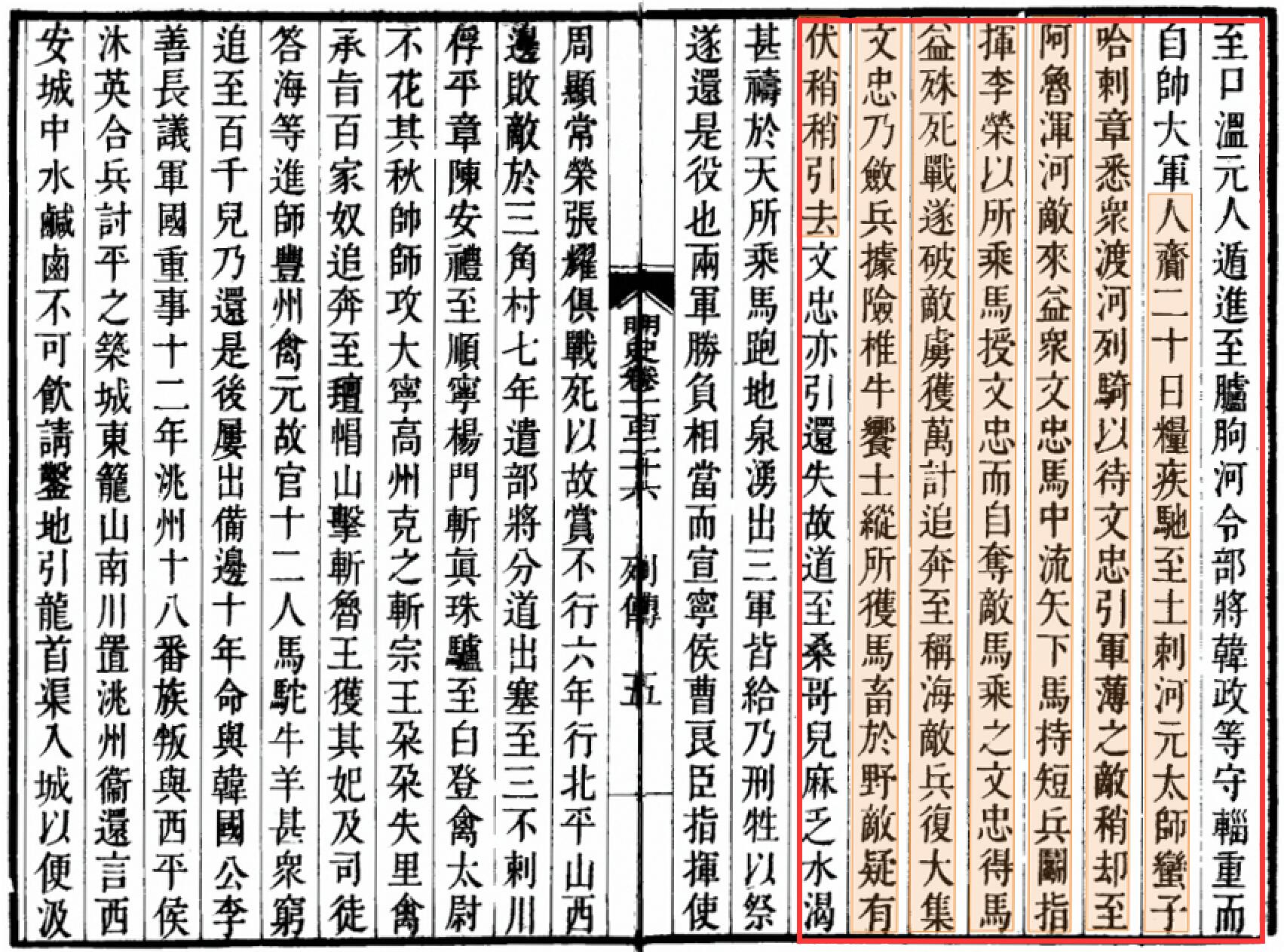 洪武五年(1372),李文忠又以左副将军的身份由东路北征,出居庸关,直趋和林(元朝岭北行省首府,今蒙古国前杭爱省西北角),抵达口温(今内蒙古查干诺尔南),北元军队逃窜。军队进至胪朐河时,李文忠部将保护辎重,自己率领骑兵,每人携带二十天口粮,奔袭土剌河。北元太师率部列阵以待,李文忠则率军进逼并持续攻击,甚至坐骑中箭后,他依然手持短兵器继续战斗,直至敌军败退。在追击过程中,敌军重新聚集。李文忠审时度势,收兵据险,并杀牛犒劳士兵,同时将所获马匹放归野外。敌军怀疑有埋伏,缓缓引军离去。此后,李文忠屡次率军戍守边境。