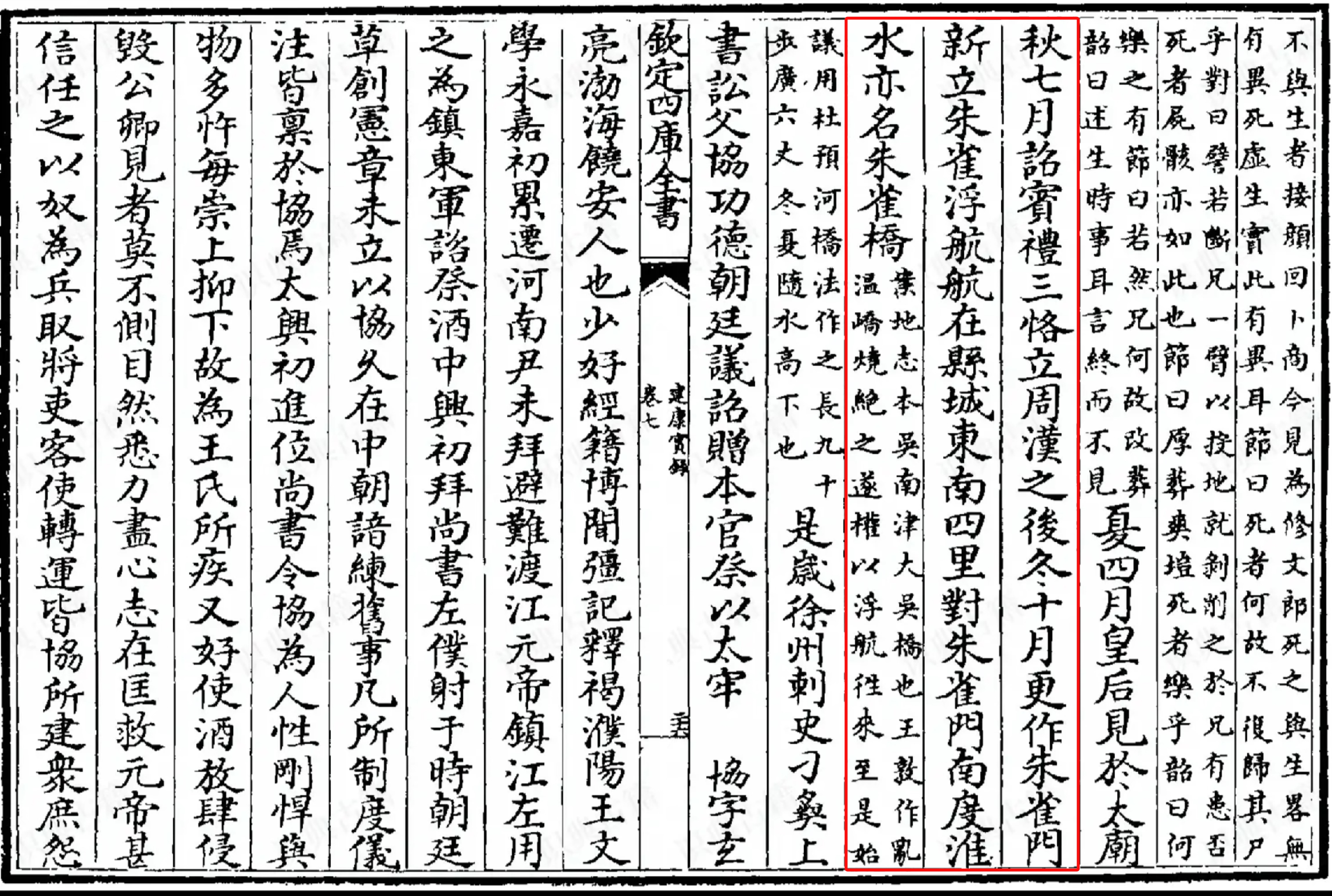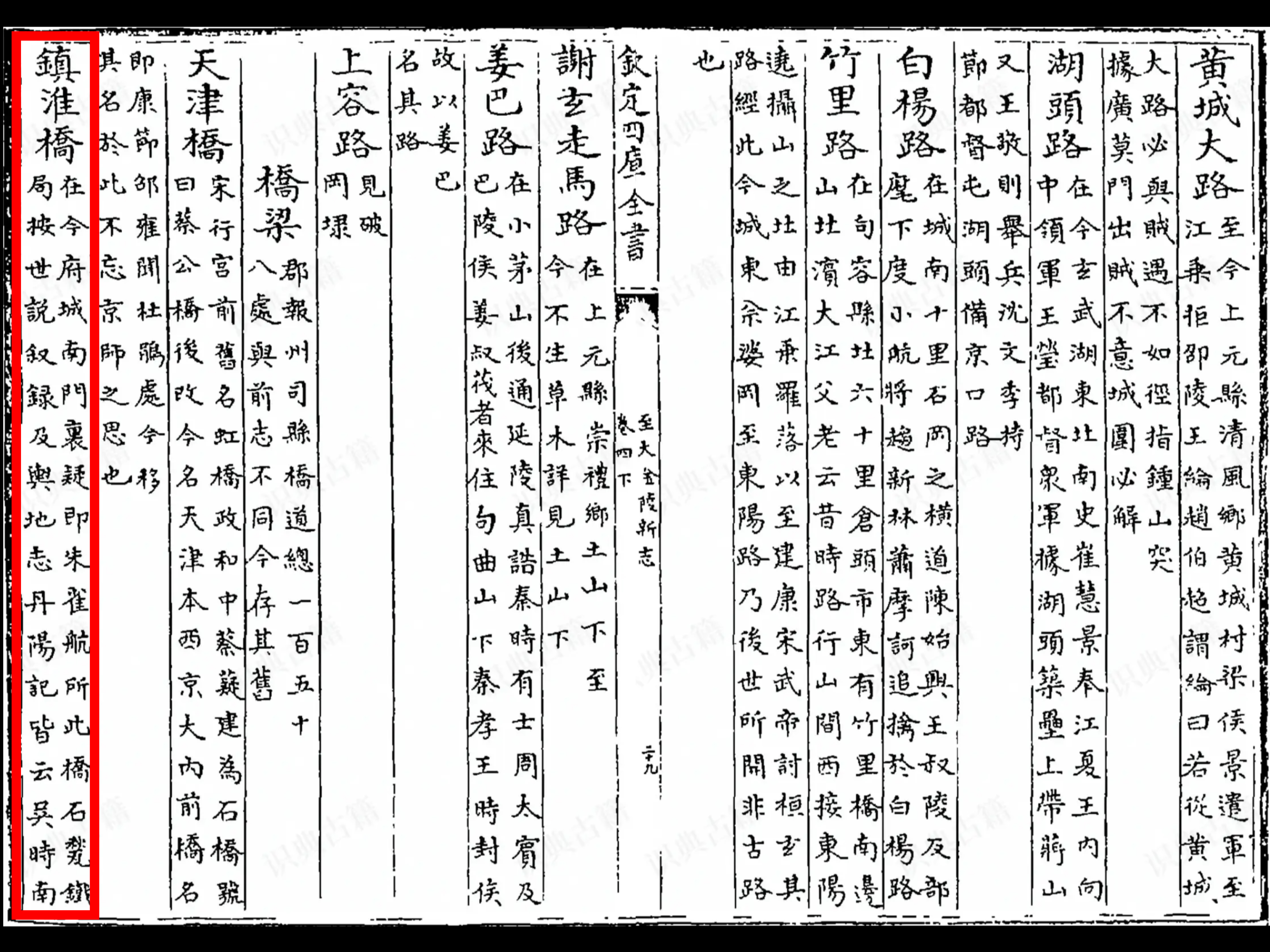 那么朱雀桥原来在何处呢?南宋《景定建康志》说:“镇淮桥,在今府城南门里,即古朱雀航所(旧志)。”该志先引旧志说镇淮桥即古朱雀航,接着又考证说:“今四航皆废,镇淮桥即朱雀航旧所也。”这一说法有多少可信度呢?元朝张铉《至正金陵新志》说:“镇淮桥在今府城南门里,疑即朱雀航所。”张铉对《景定建康志》的说法持 “疑”态度。
