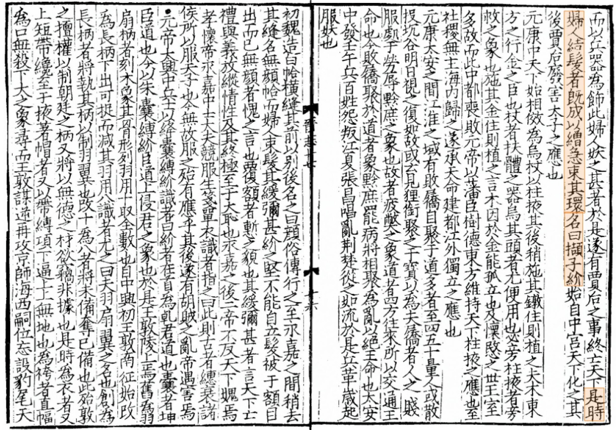 六朝女子的发髻有一个变化的过程。早期发髻往往不留鬓角,头发统统梳上去,髻紧贴头上或垂于脑后,与汉代妇女的发式差不多。南京板桥石闸湖西晋墓中出土的一件青瓷女俑的发髻,就是将头发全部束在头顶上,偏一侧绕一小环,然后用巾帕缠裹束缚而成,显得干净利落。这种髻或许就是《晋书·五行》中提到的“结发者既成,以缯急束其环”的“撷子紒”(紒即髻)。