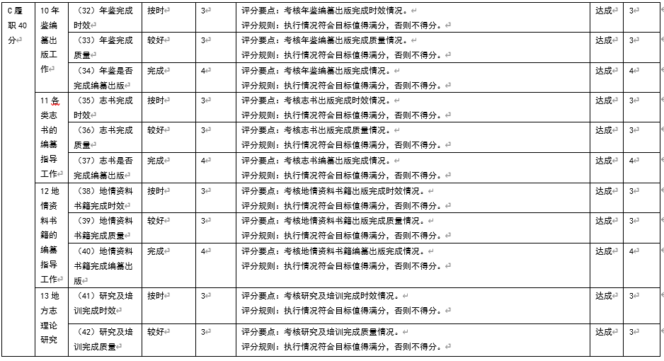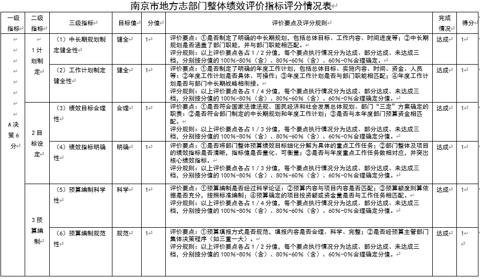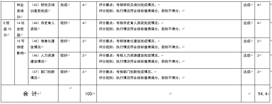 2024年度市地方志办公室部门整体支出绩效评价综合评价得分为94.40分。其中,部门决策6分,过程44分,履职40分,效益10分,综合绩效评价为“优”,具体情况见表8,详见附件(部门整体绩效评价得分表)。