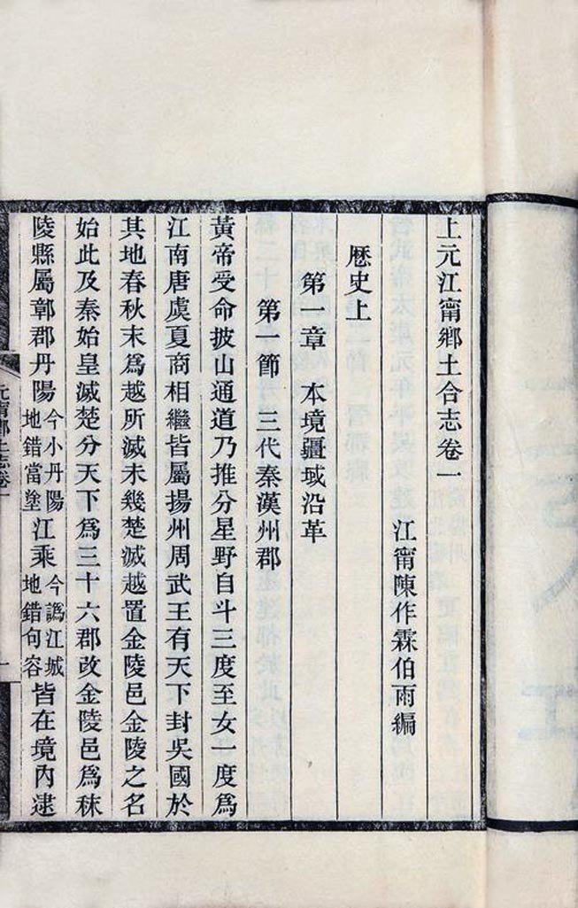 《上元江宁乡土合志》为清末陈作霖所编,计凡六卷二十二章。此志卷一卷二为历史,涵四章:一为本境疆域沿革,二为本境城垣沿革,三为本境历朝吏治,四为本境历朝兵事;卷三地理,涵五章:一为江宁府城中街道,二为元、宁两县诸山,三为元、宁两县诸水,四为元、宁两县乡镇,五为元、宁两县界址;卷四卷五为人类,涵八章:一为本境世族,二为本境仕宦,三为本境文学,四为本境武侠,五为本境忠孝,六为本境高隐,七为本境宗教,八为本境贤媛;卷六为物产,涵五章:一为本境植物品,二为本境动物品,三为本境矿物品,四为本境食物品,五为本境用物品。