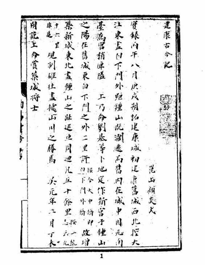 《建康古今记》书名虽称古今,然所述内容,主要是明太祖朱元璋立国定都南京后的史事。所记史事细密详尽,可补他书之不足。全书共十卷,分别为卷一筑城门名、卷二坛庙、卷三宫阙宫门、卷四山陵、卷五祠庙、卷六官署学校、卷七府卫马群、卷八府县园囿仓庾、卷九寺观酒楼塔坊、卷十冢墓。其内容涉关国家礼仪、祭典、宫阙及政治、军事、教育之制度与设施,尤详于坛庙、宫阙、陵坟、祠庙、学校、府卫及开国之王、公、侯墓。其对地方史研究和顾炎武研究具有一定参考价值。